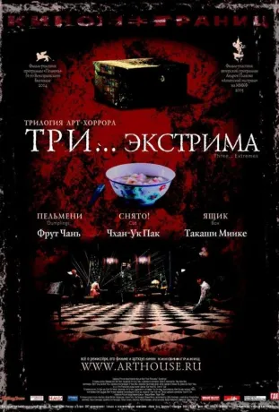 Азиатский кинематограф манит своей красотой и пугает сложностью сюжетов и характеров главных героев. «Три... экстрима» – это три истории, каждая из которых наполнена своей атмосферой и мистицизмом. Первая новелла рассказывает о женщине по имени Цин. Когда-то она блистала своей красотой на телеэкранах, а теперь стала женой знаменитого бизнесмена. Её мечта – снова стать молодой, и однажды женщине представился случай сделать мечту реальностью. Но почему новелла называется «Пельмени»? Вторая история повествует об успешном режиссёре Рю. Новелла «Снято» начинается довольно позитивно: герой счастлив со своей женой и успешен. Мужчине кажется, что жизнь всегда будет преподносить только приятные сюрпризы. Но завистники не дремлют. Однажды актёр массовки приходит домой к Рю, чтобы предоставить ему ужасный выбор, в котором нет правильного варианта. Третья новелла называется «Ящик». Это история об одинокой и красивой Киоко, которая пишет книги. Она успешна, но несчастна: в детстве из-за Киоко погибла сестра-близнец. Учитель девушки не смог переносить душевные муки, находясь рядом с виновницей смерти его ученицы. Киоко посвятила годы, чтобы отыскать учителя. Однажды она увидела на своём столе цветы и письмо с приглашением на свидание в том месте, где погибла её родная сестра. Но к чему приведёт эта встреча? Какая же развязка ждёт героев в трёх совершенно разных и несвязанных между собой историях?